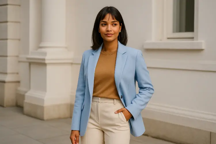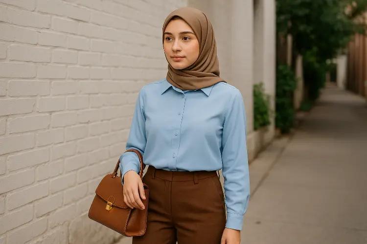 Kalau ingin tampil lebih dewasa, coba padukan powder blue dengan cokelat. Cokelat memberi kesan hangat, sementara powder blue menyeimbangkan agar tetap segar.
