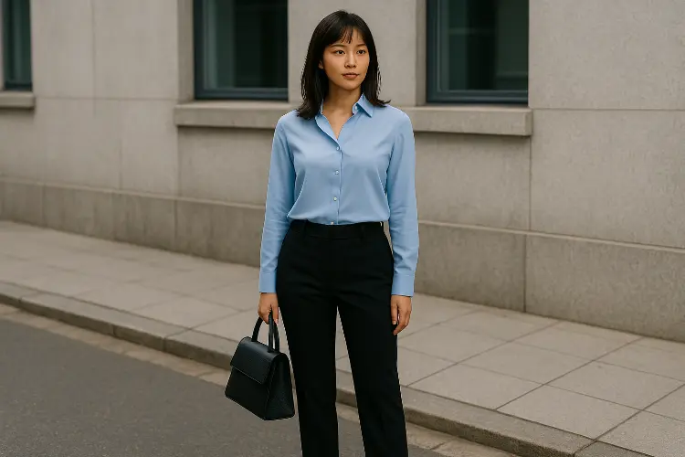 Untuk look yang lebih strong, kontras powder blue dengan hitam bisa jadi pilihan terbaik. Warna biru pastel bikin look tetap lembut, sementara hitam memberi kesan tegas dan profesional.