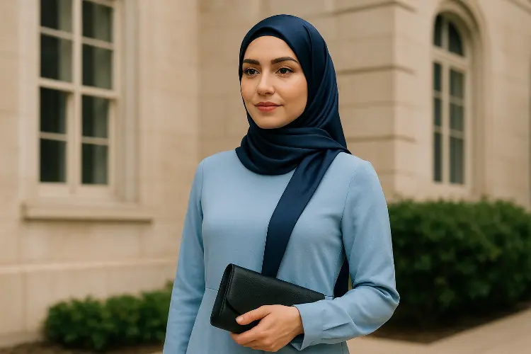 - Dress powder blue dengan hijab navy satin untuk look formal.