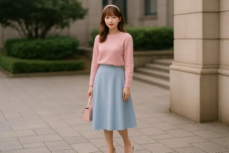 - Padukan sweater pink pastel dengan rok powder blue.