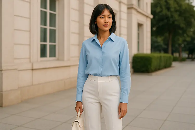 - Pilih blouse powder blue dengan celana putih high waist untuk siluet ramping.