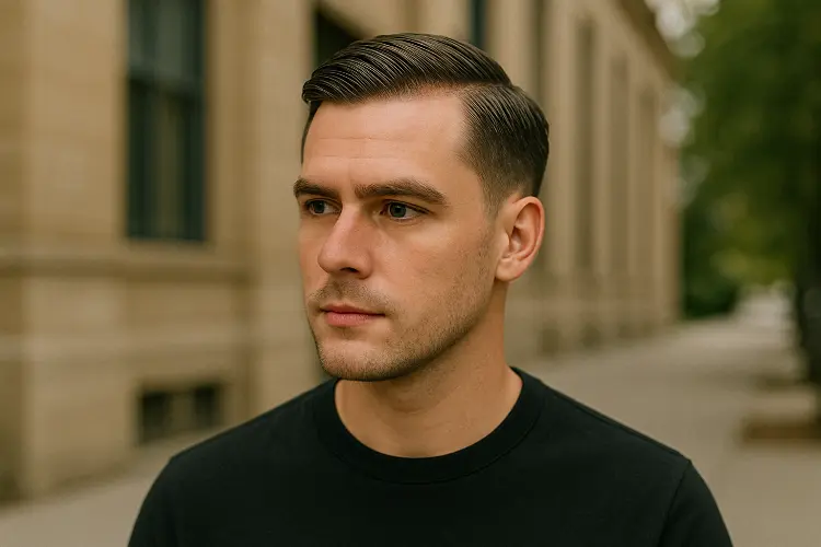 Rambut bagian atas disisir rapi ke satu sisi, sementara samping biasanya dipotong pendek atau dipadukan dengan undercut. Look ini bikin wajah lebih proporsional dan memberi kesan profesional.